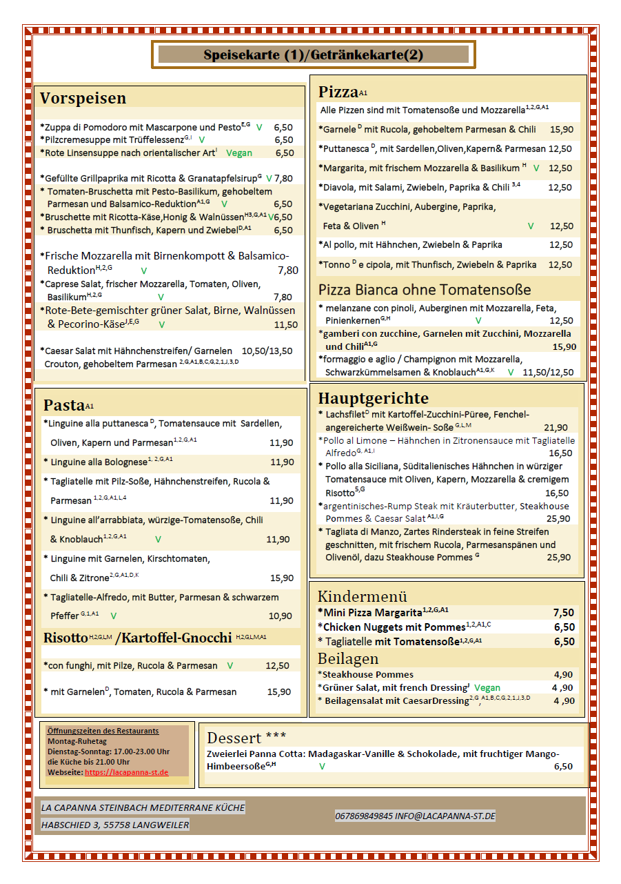 Schön,  dass Sie da sind. Im la Capanna Steinbach  geht es uns darum, Menschen  mit gutem Essen zusammenzubringen. Ob Sie nur auf einen schnellen Happen  vorbeischauen, mit Familie und Freunden essen oder etwas Besonderes  feiern – bei uns sollen Sie sich wie zu Hause fühlen. Unsere Küche steht  für frische Zutaten, ehrliche Aromen und die Freude am gemeinsamen  Genießen. Nehmen Sie Platz – Sie sind jederzeit herzlich willkommen an  unserem Tisch.